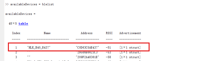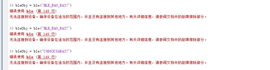 输入 blelist 搜索附近蓝牙设备命令可以正常执行,并且列出设备中有B40设备。但是输入ble("address")命令,连接指定地址设备时,matlab连接失败。d947218d035eb3ef2e67edfe920a16d7.png